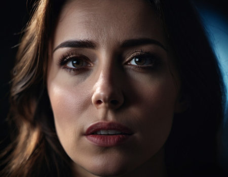 Woman with furrowed brows and worried expression looks directly at camera. Lighting is dim, casting shadows around face, emphasizing her stress. Fear, frustration, upset, worry and thoughtfulness. AI.