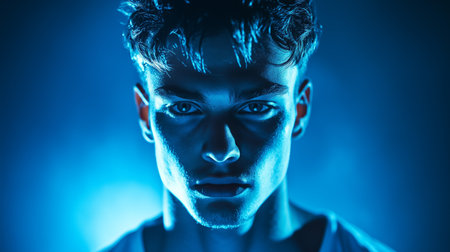 A young man with striking features poses against an intense blue background capturing an intriguing, moody atmosphere in a studio setting