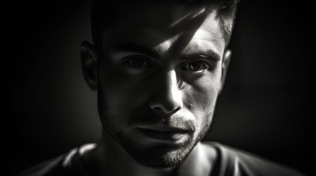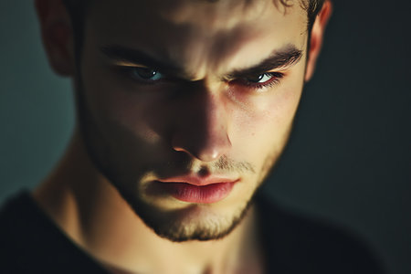 Young man in dramatic lighting gazes intensely with mysterious expression in dark setting