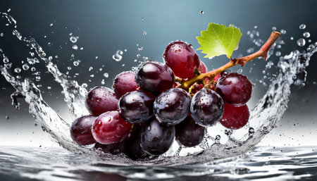 Dive into freshness with this stunning image of grapes caught in a splash of water, showing vibrant colors and dynamic movement, perfect for any project