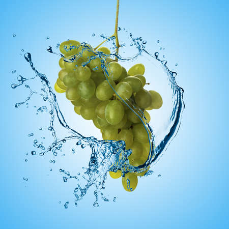 Grapes in splashes of water on a blue background