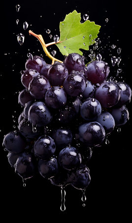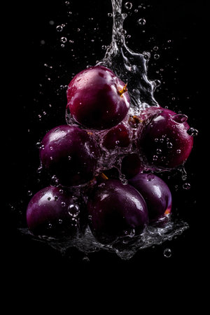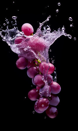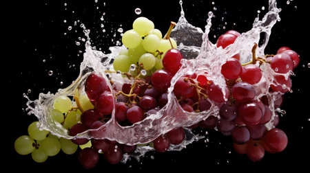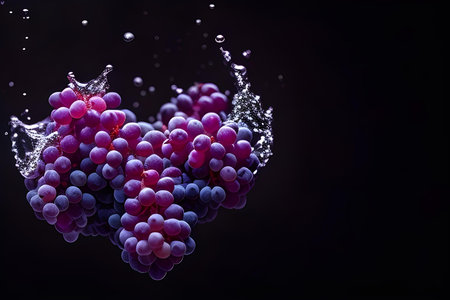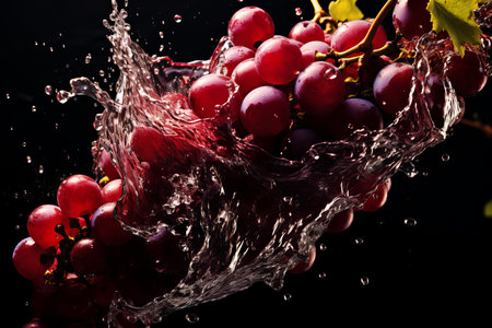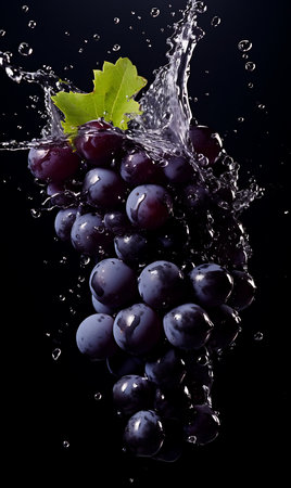 Ripe grapes on dark background in mid-splash evoke a sense of freshness, perfect for promotions of natural juices. High quality photo