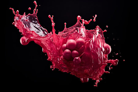 Vibrant red splash in mid-air with droplets, isolated on a black background