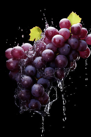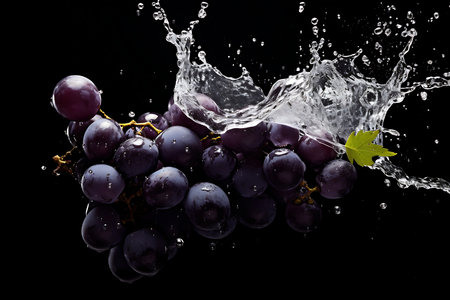 Grapes with water splash and drops on a black background.