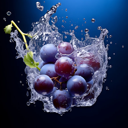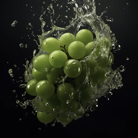 A cluster of grapes being surrounded by splashing water, creating a refreshing and rejuvenating scene.