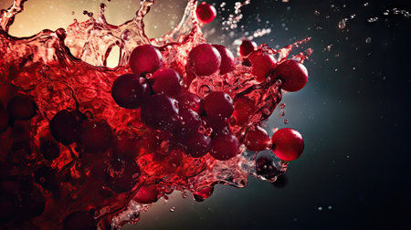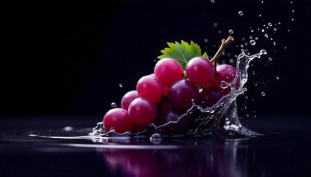 Dynamic splash of water around red grapes with droplets in the air, isolated on a dark backdrop