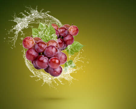 Water splash with fruits isolated on black background. Ripe grapes with water drops.