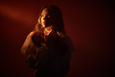 A beautiful romantic girl with long wavy hair posing in a white vintage dress. Dark red studio background with copy space. The inner world of a person, feelings and emotions.