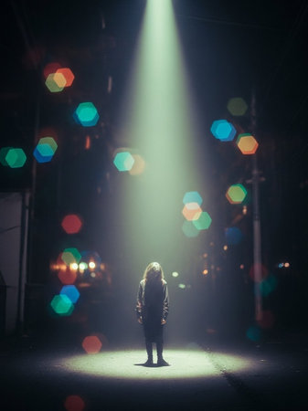 A striking female silhouette emerges beneath intense lighting, with beams piercing from above, creating a powerful and evocative atmosphere.