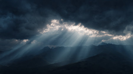 Sun rays shining through dark clouds in the mountains. Dramatic sky