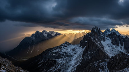 Jagged, snow-dusted mountain peaks pierce a dark, dramatic sky as golden sunbeams break through the heavy clouds, illuminating the rugged landscape.