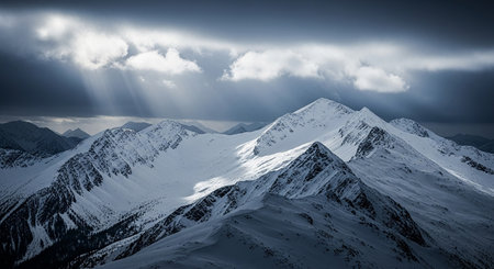 Dramatic sun rays pierce dark clouds over a vast snow-covered mountain range Clear details and vibrant colors ...