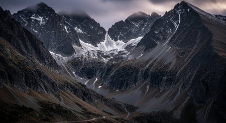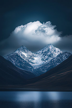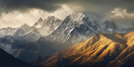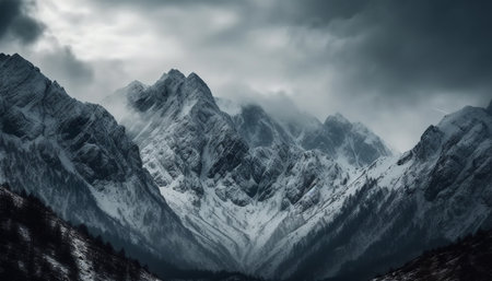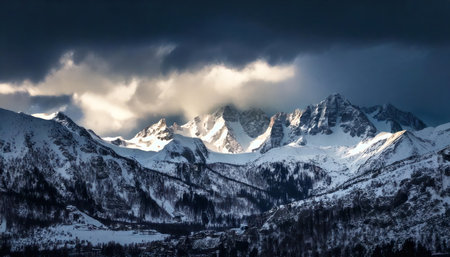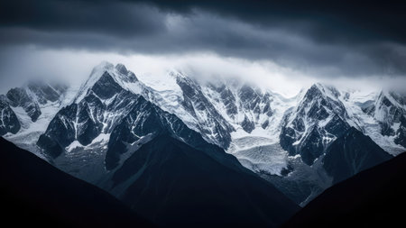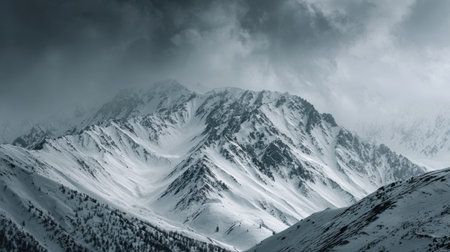 Breathtaking view of majestic snow-capped mountains under a dramatic sky, showcasing the beauty of nature and winter landscapes in a pristine environment.