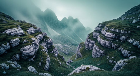 View on the mountains covered in fog from Mangart Pass that connects Italian and Slovenian side, Mangart pass