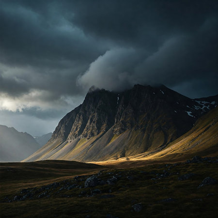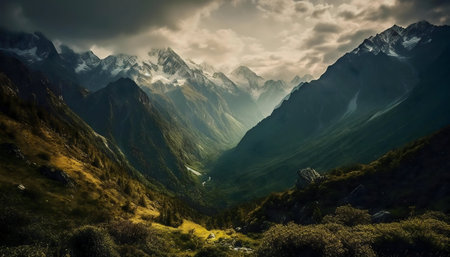 A captivating landscape showcasing towering mountain peaks shrouded in dark clouds, contrasted by a lush green valley below, evoking a sense of adventure and tranquility.
