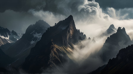 majestic mountain range shrouded in misty clouds, with snow-capped peaks visible, created with generative ai