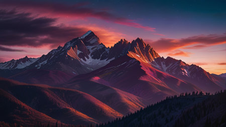 Beautiful mountain landscape with red and blue sky. 3d rendering