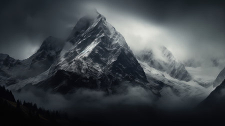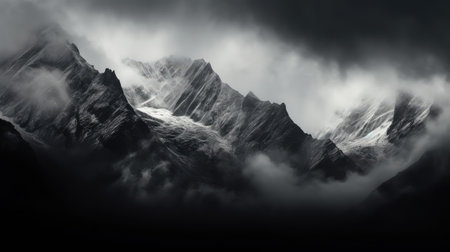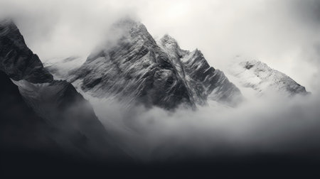 A stunning landscape presents a mountain range, dominated by peaks partially covered in snow and shrouded in mist. The image showcases a monochrome palette, emphasizing the textures of the rocks and clouds. This dramatic composition could be suitable for editorial content or creative projects, depicting the raw beauty of nature.
