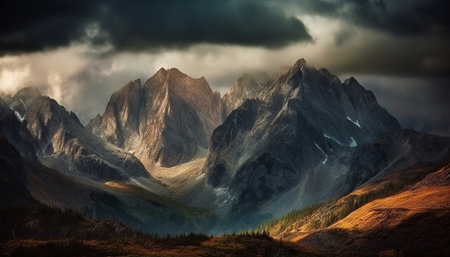 Majestic mountain range, panoramic landscape, extreme terrain, tranquil scene generated by artificial intelligence