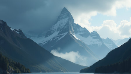 A very tall mountain rises majestically, its towering peak blanketed in snow under a cloudy sky. The landscape exudes a sense of grandeur and awe-inspiring beauty.