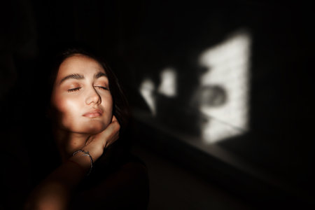 Portrait of beautiful girl with closed eyes. Woman with shadows on her face. Concept of sunbathing, relaxation. High quality photo