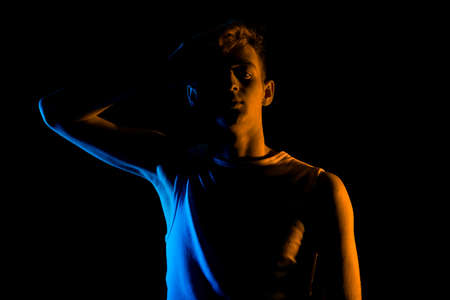 Interesting effect. Portrait of twin brothers. Studio shot in dark studio with neon light.
