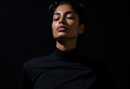 Model posing with light illuminating her face and looking up with a sense of awe and wonder. Ai generated