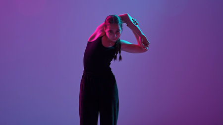 Attractive woman dancing jazz-funk in pink, green and blue neon light in a studio. Modern dynamic and energetic dance choreography. Medium full.