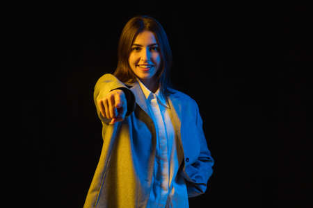A young woman works on an invisible touch screen. A woman in the studio on a blue background in pink and green neon light. Futuristic technology.