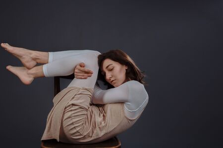 A girl in simple clothes curled up in a chair. Shot in a studio with a gray background.