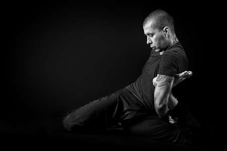 Portrait of strong muscular ballet or contemporary dancer performing on stage with dramatic and dark light. Strong male body dance performance. In braking gender stereotypes and men dance concept.