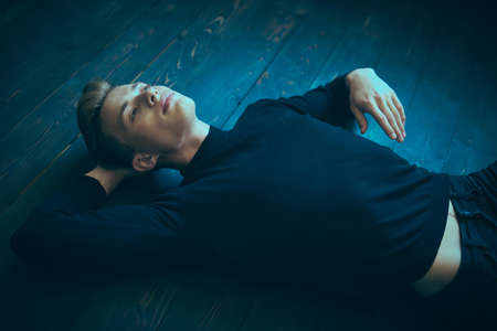Male beauty, fashion. Portrait of a handsome young man in black clothes lying on a floor.