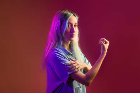 Sexy young blonde girl portrait over gray paper background in neon lights