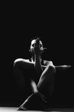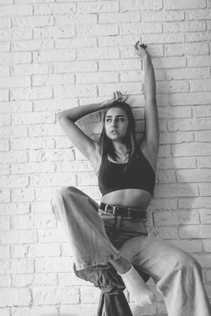 Black and white art photo, beautiful brunette dancing in front of the camera and taking fashion poses
