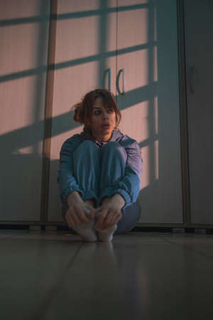Woman sitting on the floor in the dark after shooting up with heroin; female drug addict after intravenous heroin injection wasted on the floor