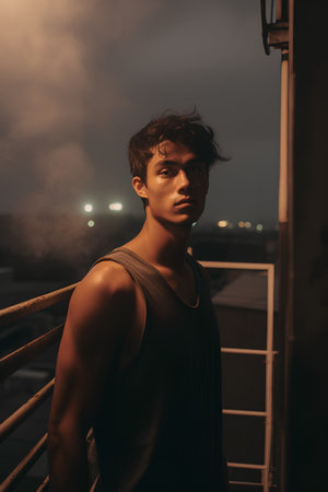 Handsome young man with muscular body and wet hair standing on balcony at night
