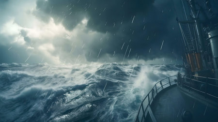 A ship confronts a raging storm at sea. Heavy rain and massive waves create a dramatic scene.