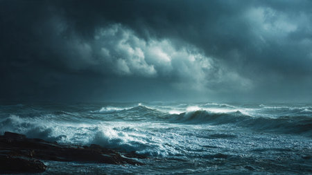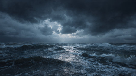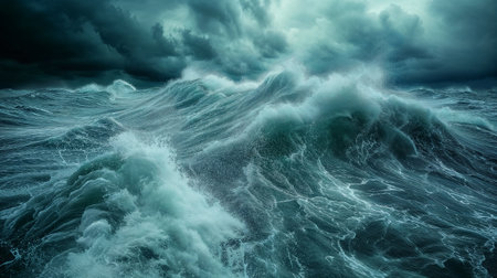 Turbulent sea waves rise and fall under dark clouds, creating a dramatic atmosphere in the ocean.