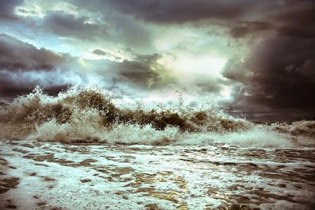 View of a stormy sea and dramatic cloudy sky, big waves are crashing on the shore