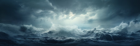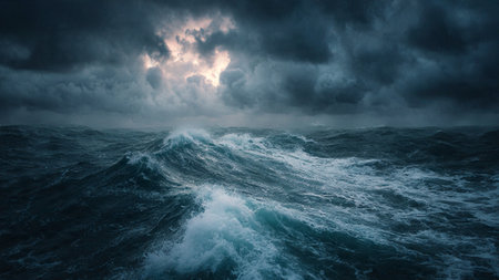 A powerful ocean storm with dark, towering clouds, crashing waves, and rays of light piercing through, evoking a sense of awe and the raw power of nature during a tumultuous weather event. AI generated image