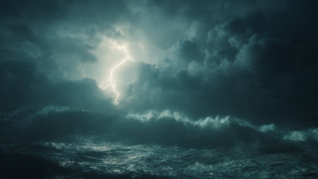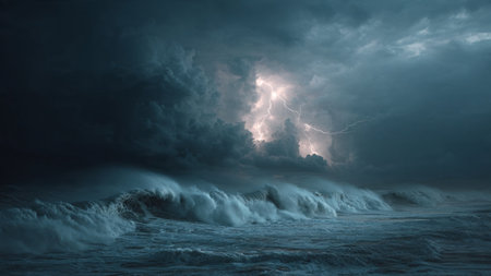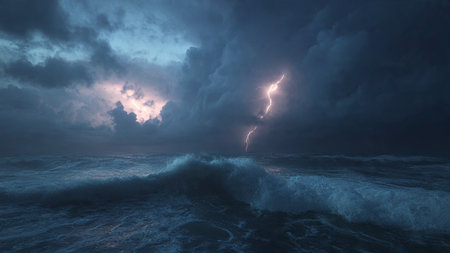 A powerful storm brews over the ocean as lightning strikes in the distance. Dark clouds swirl menacingly above crashing waves, creating a breathtaking and intense atmosphere.