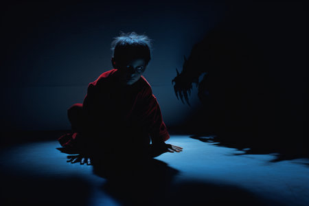 A captivating portrait featuring a person surrounded by their own shadows, showcasing a play of light and emotion that evokes depth and introspection.