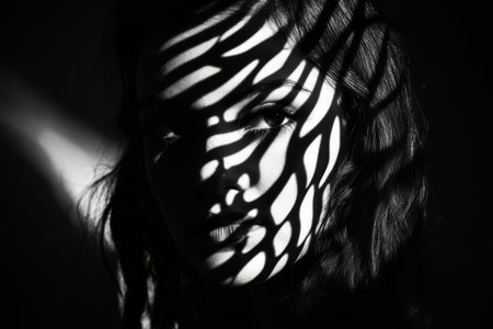 A dramatic and artistic black and white portrait of a mysterious woman, her face partially obscured by shadows and abstract patterns.