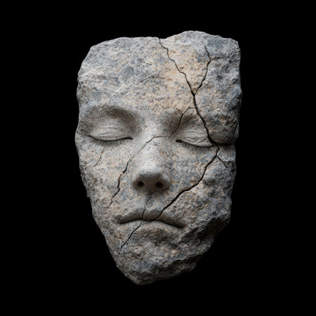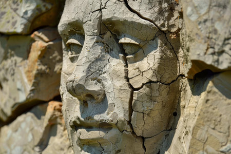a stone face sculpture, perched atop a rugged rock wall, showcases the artistic style of cubist fragmented reality. with vray tracing, torn and distressed edges, this hyperrealistic creation captivates viewers. crafted by a skilled wood sculptor, the sculpture exhibits a gloomy ambiance, achieved through the heavy use of palette knives. ai generated