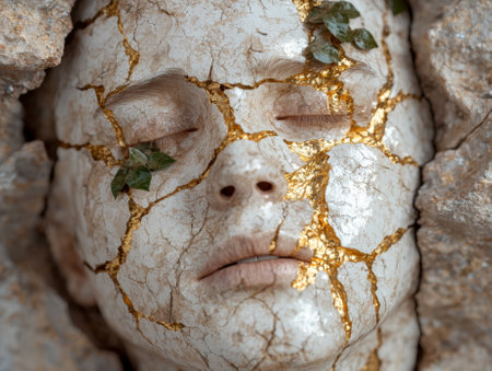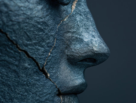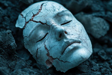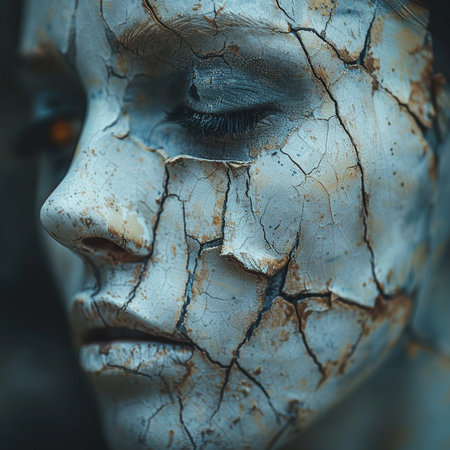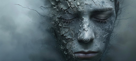 Cracked face in the clouds, representing fragility and emotional vulnerability.
