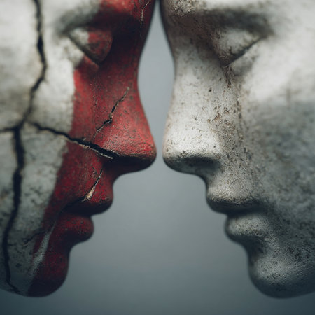 A sculpture of two masks one with symmetrical features and the other with mismatched halves symbolizing the duality of symmetry breaking