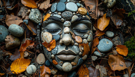 A serene face, crafted from a mosaic of smooth river stones, rests peacefully on the forest floor.