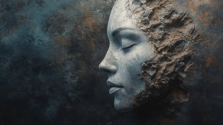 A serene womans profile merges with a textured surface creating a striking contrast between form and background highlighting artistic expression.