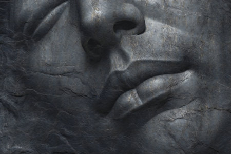 A close-up view of a beautifully textured stone face, capturing the intricate details of an ancient sculpture. The play of light on its surface evokes a sense of history and artistry.