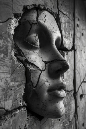 A face is carved out of a wall, with the eyes and mouth missing. The face is made of concrete and has a rough, unfinished appearance. Concept of emptiness and loneliness
